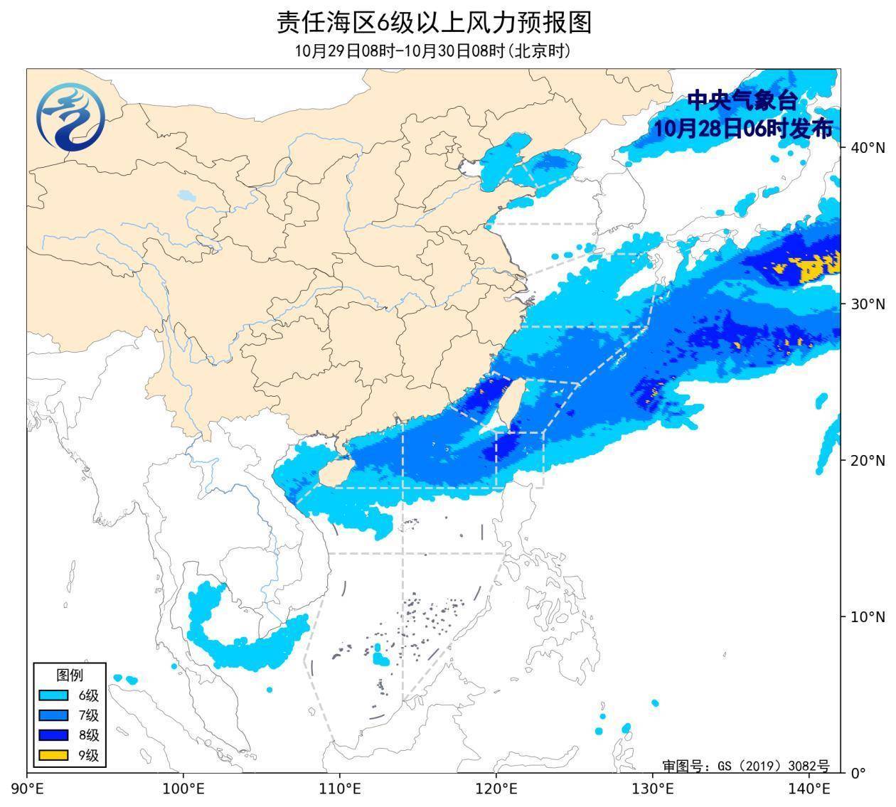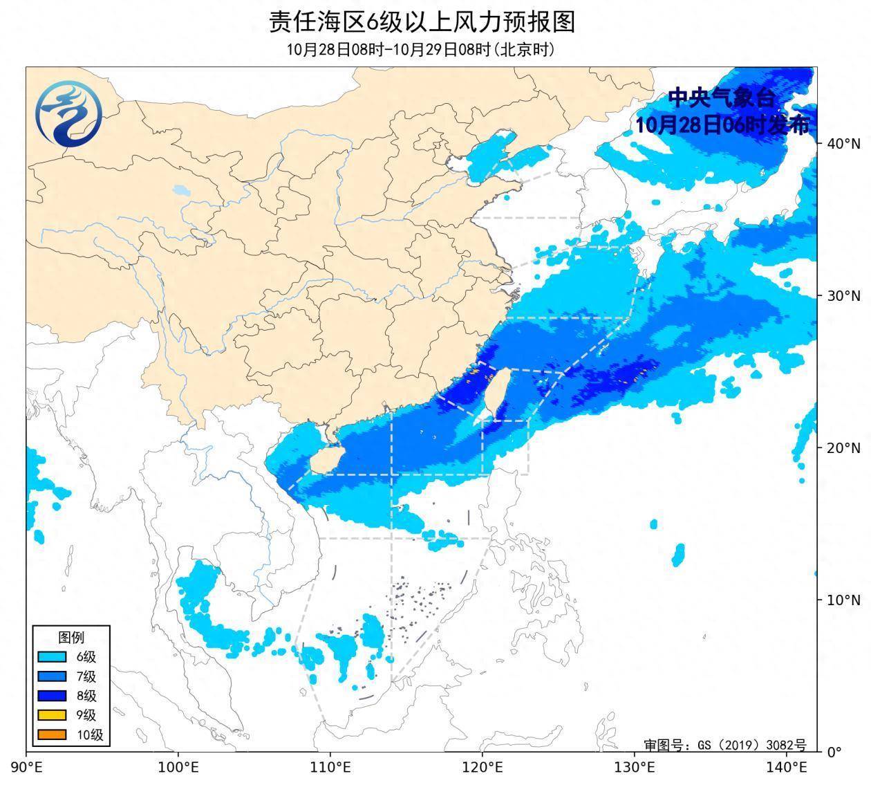 28日08时至29日08时,台湾海峡、台湾以东洋面将有6~8级、阵风9级的东北风,东海南部海域、巴士海峡、北部湾、琼州海峡、南海北部和中西部海域将有5~7级、阵风8级的偏东到东北风,渤海将有4~6级、阵风7级的偏南到西南风,渤海海峡、黄海北部海域将有4级以下的偏南风增大到5~6级、阵风7级的西南风,东海北部海域、南海中东部海域将有5~6级、阵风7级的偏东到东北风。